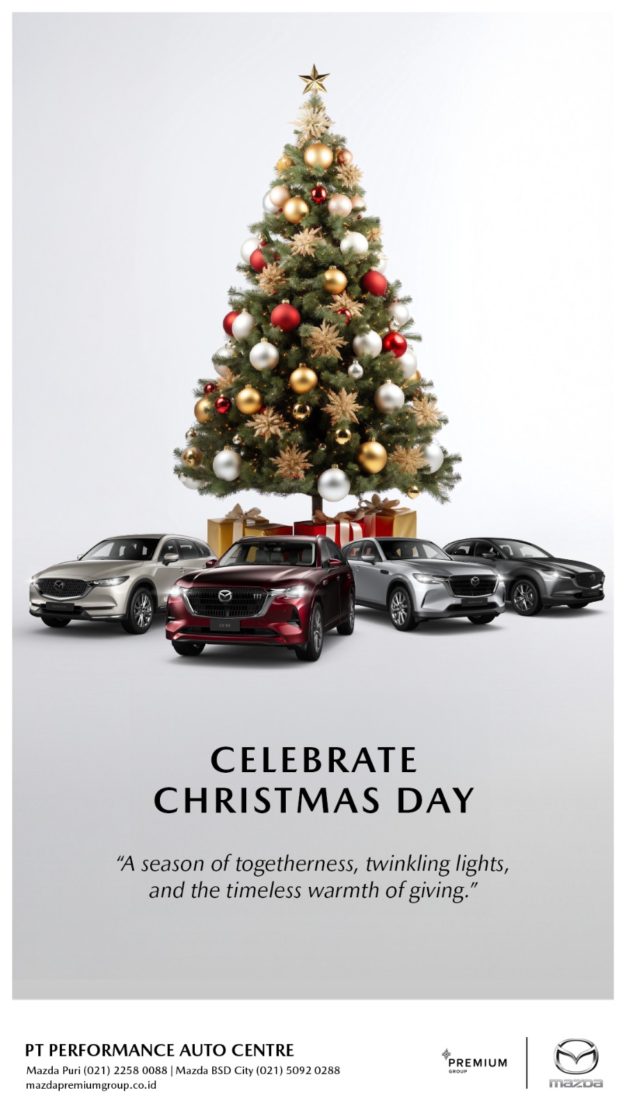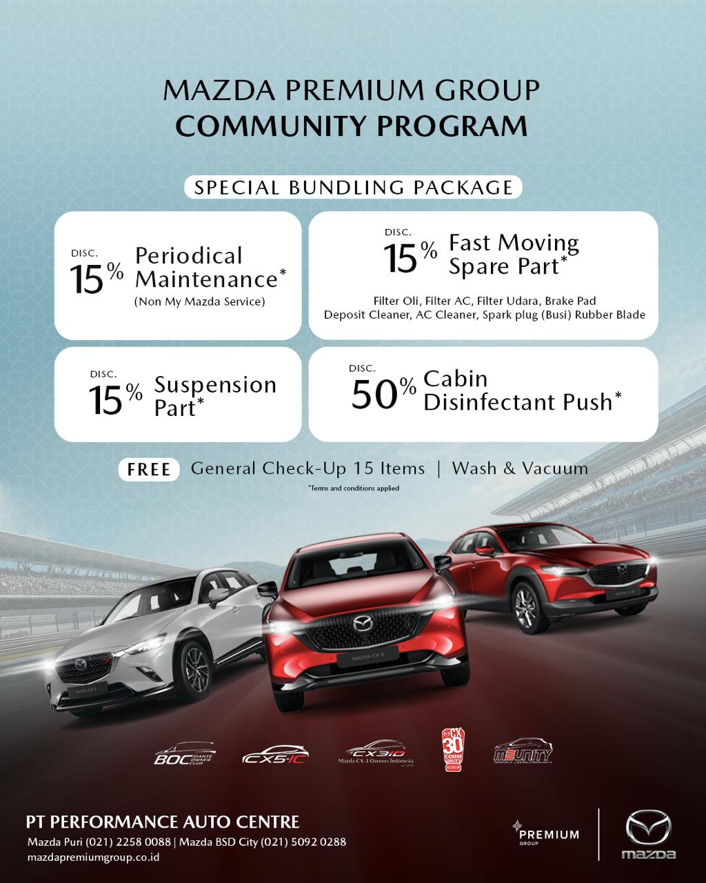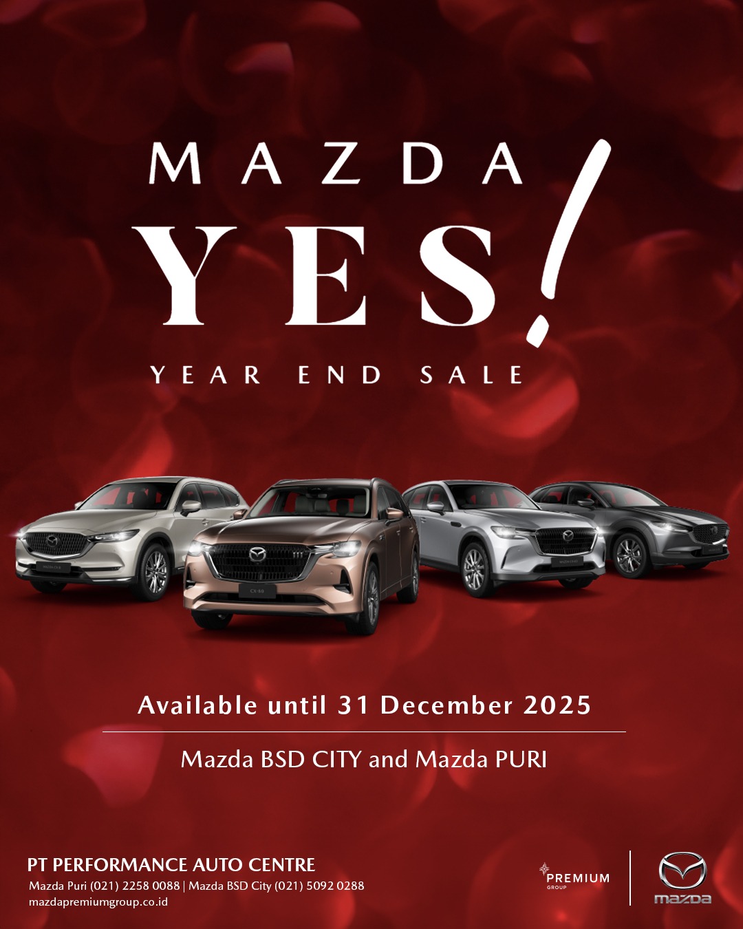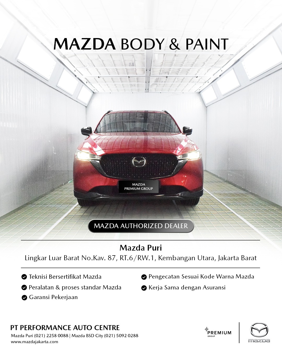 Sebagai dealer resmi Mazda, Premium Group hadir dengan komitmen untuk memberikan pengalaman terbaik bagi para pecinta dan calon pemilik Mazda. Didukung oleh tim Sales yang berpengetahuan luas dan berdedikasi tinggi, Premium Group siap memandu Anda melalui setiap pilihan model, memberikan informasi mendetail, mengatur test drive yang memuaskan, hingga proses pemesanan yang lancar dan menyenangkan. Lebih dari sekadar transaksi, Premium Group membangun hubungan yang erat dengan pelanggan, memastikan setiap interaksi mencerminkan standar pelayanan Mazda yang prima. Dengan fasilitas modern dan suasana yang nyaman, Premium Group adalah destinasi utama Anda untuk merasakan dan memiliki Mazda impian dengan keyakinan penuh.