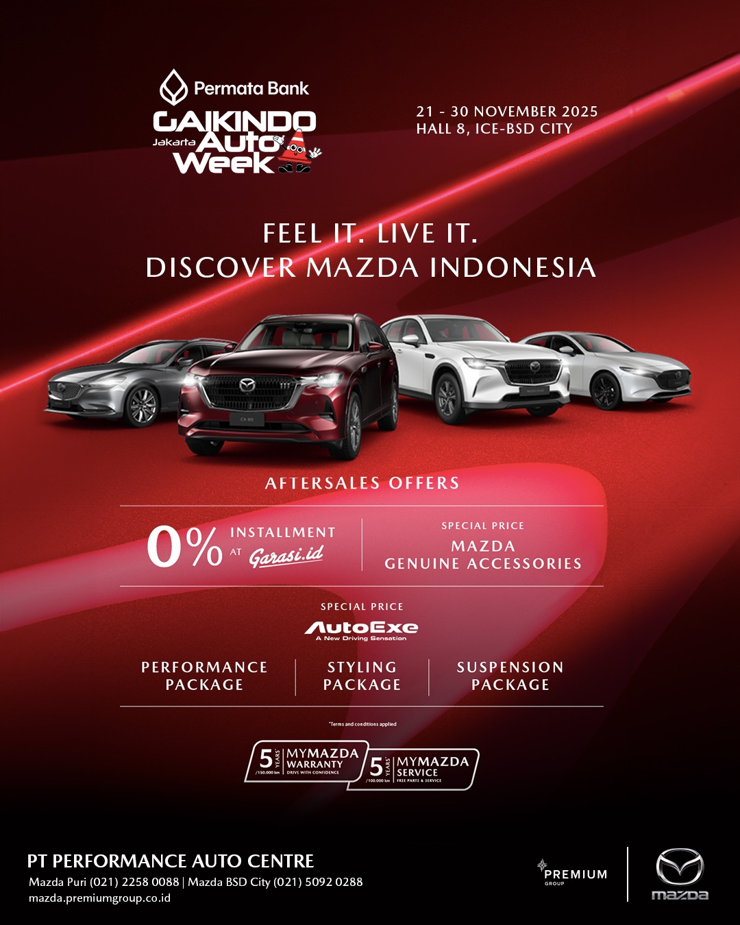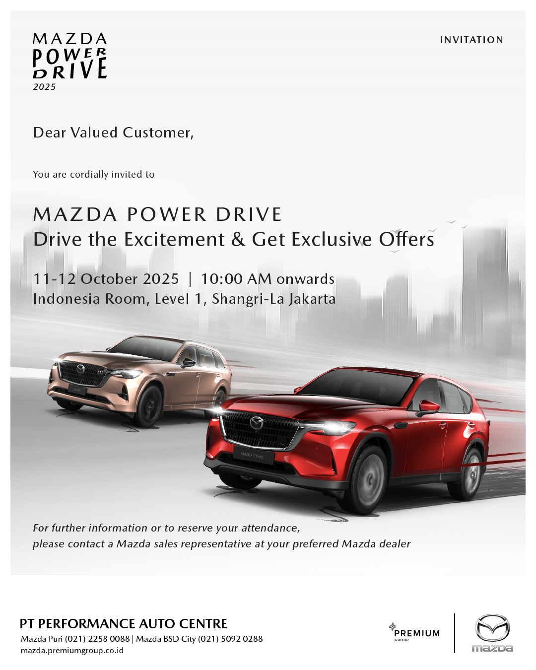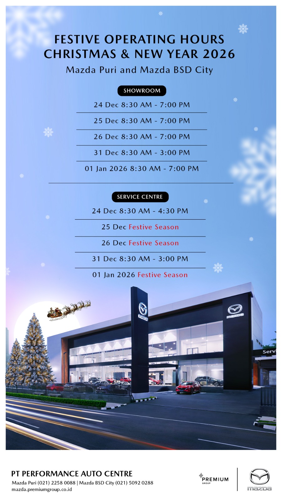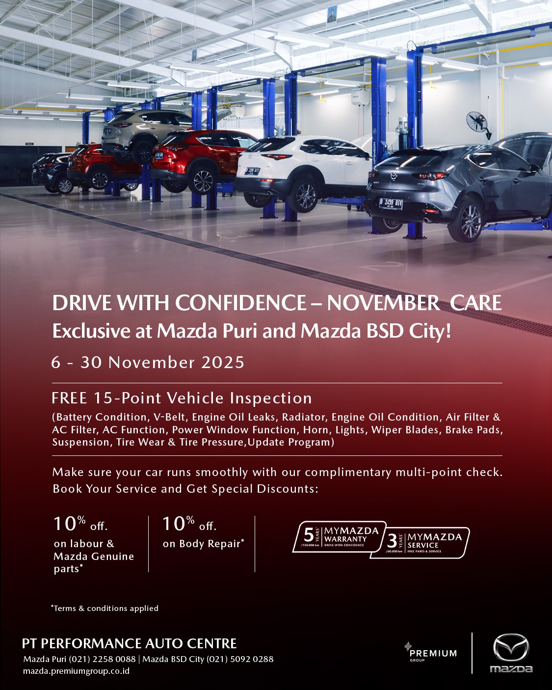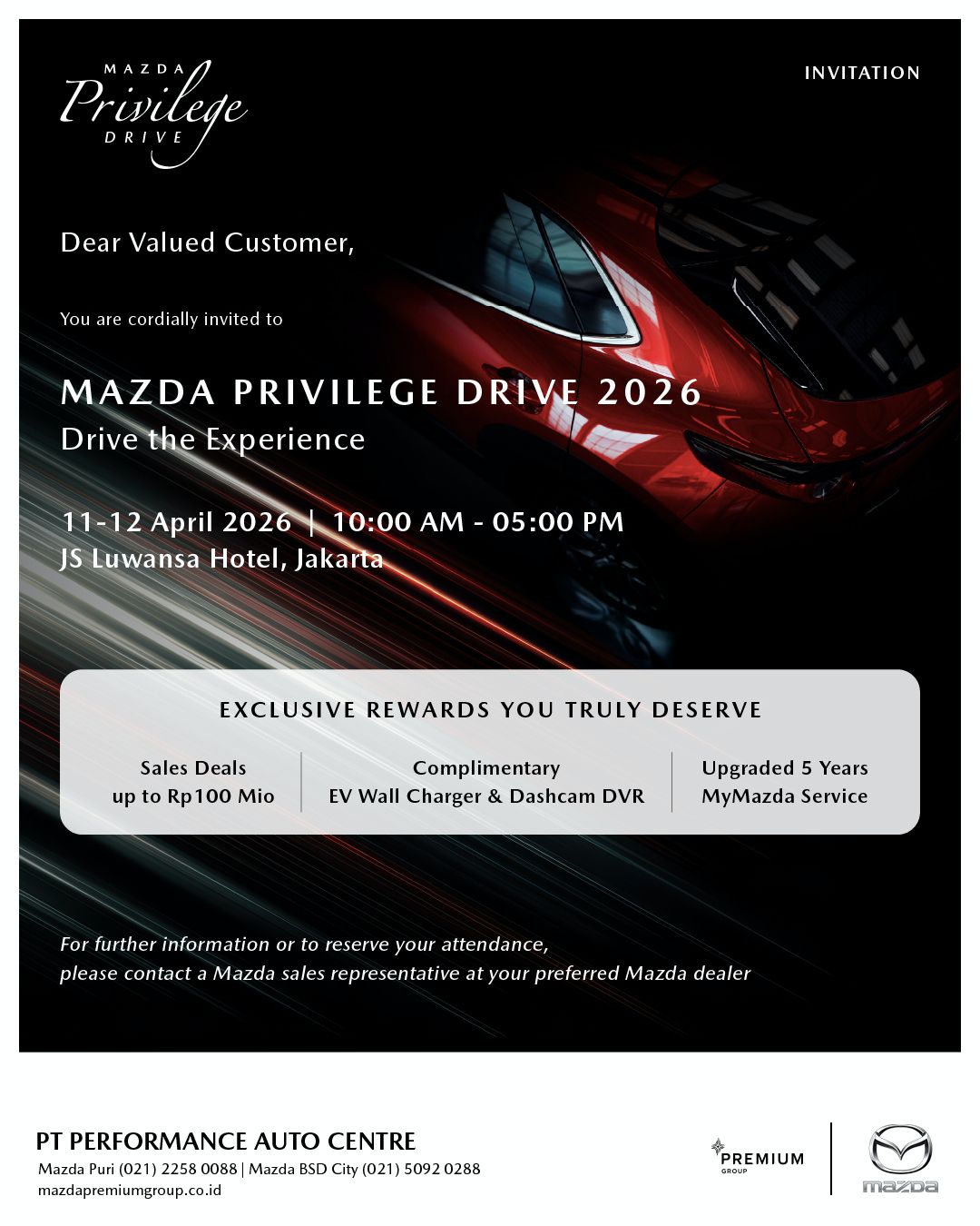 Sebagai dealer resmi Mazda, Premium Group hadir dengan komitmen untuk memberikan pengalaman terbaik bagi para pecinta dan calon pemilik Mazda. Didukung oleh tim Sales yang berpengetahuan luas dan berdedikasi tinggi, Premium Group siap memandu Anda melalui setiap pilihan model, memberikan informasi mendetail, mengatur test drive yang memuaskan, hingga proses pemesanan yang lancar dan menyenangkan. Lebih dari sekadar transaksi, Premium Group membangun hubungan yang erat dengan pelanggan, memastikan setiap interaksi mencerminkan standar pelayanan Mazda yang prima. Dengan fasilitas modern dan suasana yang nyaman, Premium Group adalah destinasi utama Anda untuk merasakan dan memiliki Mazda impian dengan keyakinan penuh.